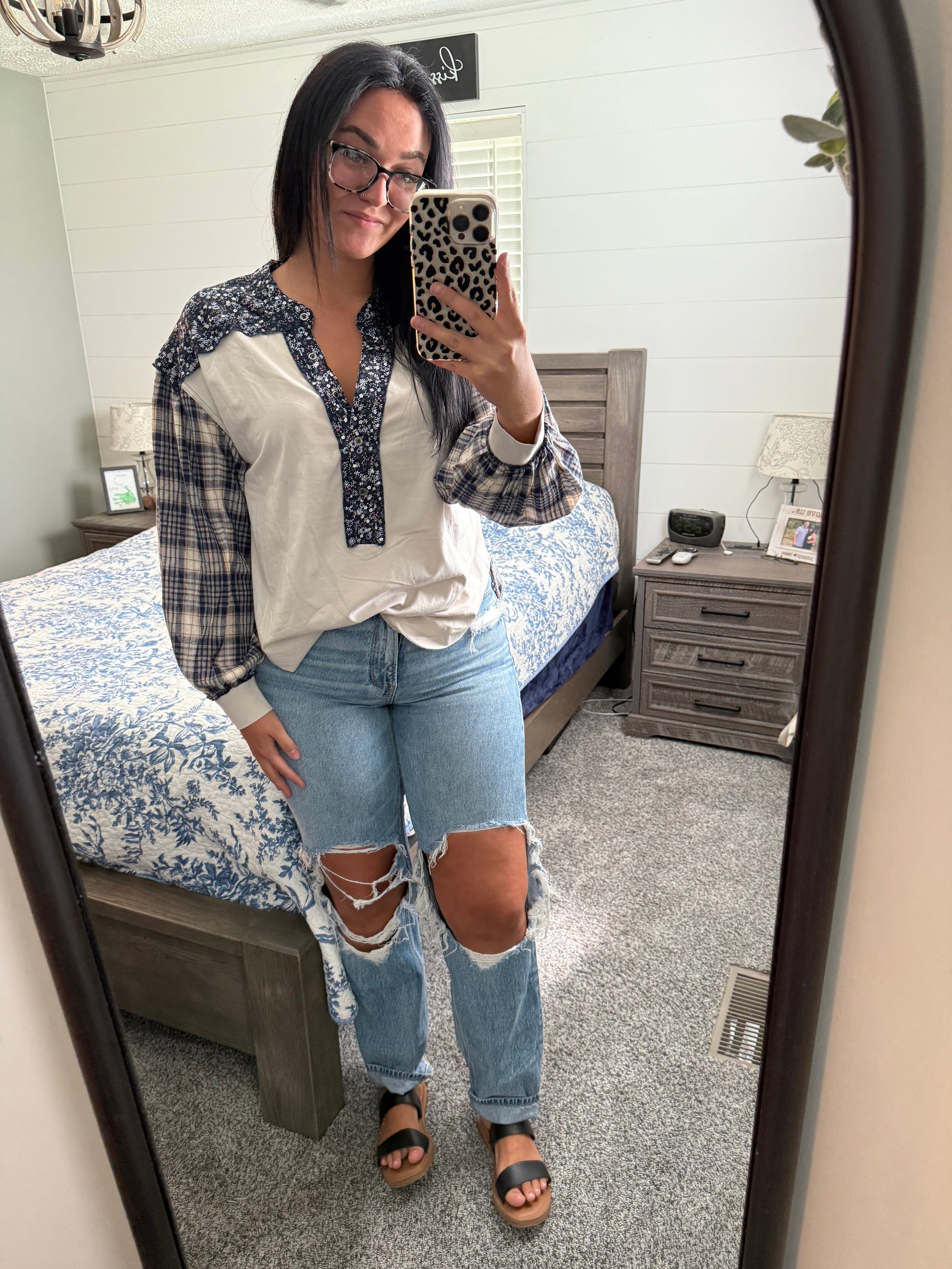 This boho blouse features a mix of floral and plaid print patchwork, a henley-inspired buttoned neckline, dropped shoulders, long puff sleeves with contrasting cuffs, AND raw edge detailing throughout. Our Floral Plaid Patchwork Top will be a great addition to your summer and fall outfits!