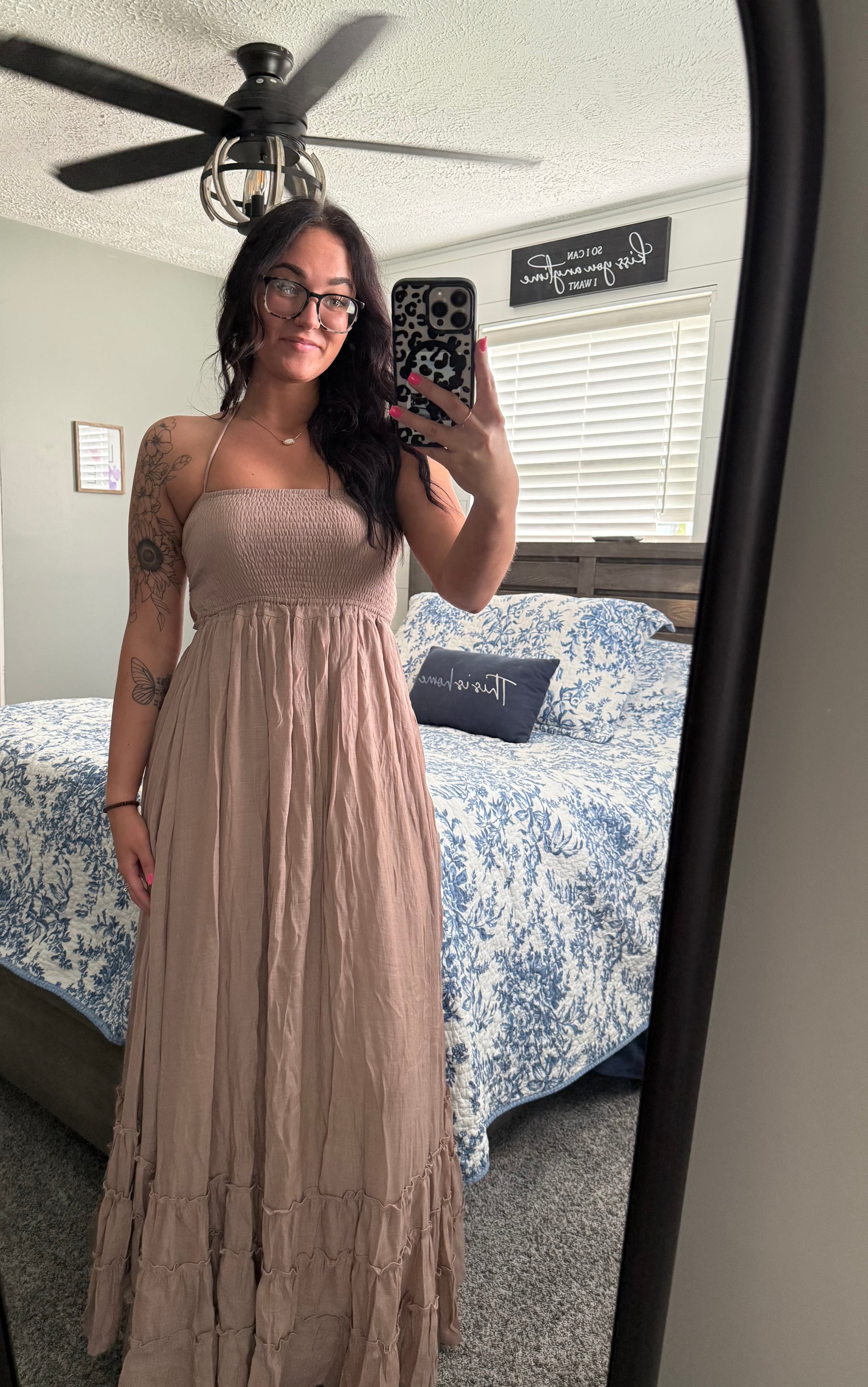 Our Sweet Summertime Maxi Dress is strapless, a light weight fabric with the perfect stretchy smocked bodice + a fun strappy back! It has a raw seam detailing paired with a halter neck tie. Wear this on vacation, over a bathing suit or just for the day out - regardless enjoy the versatility AND the effortless look it will provide!