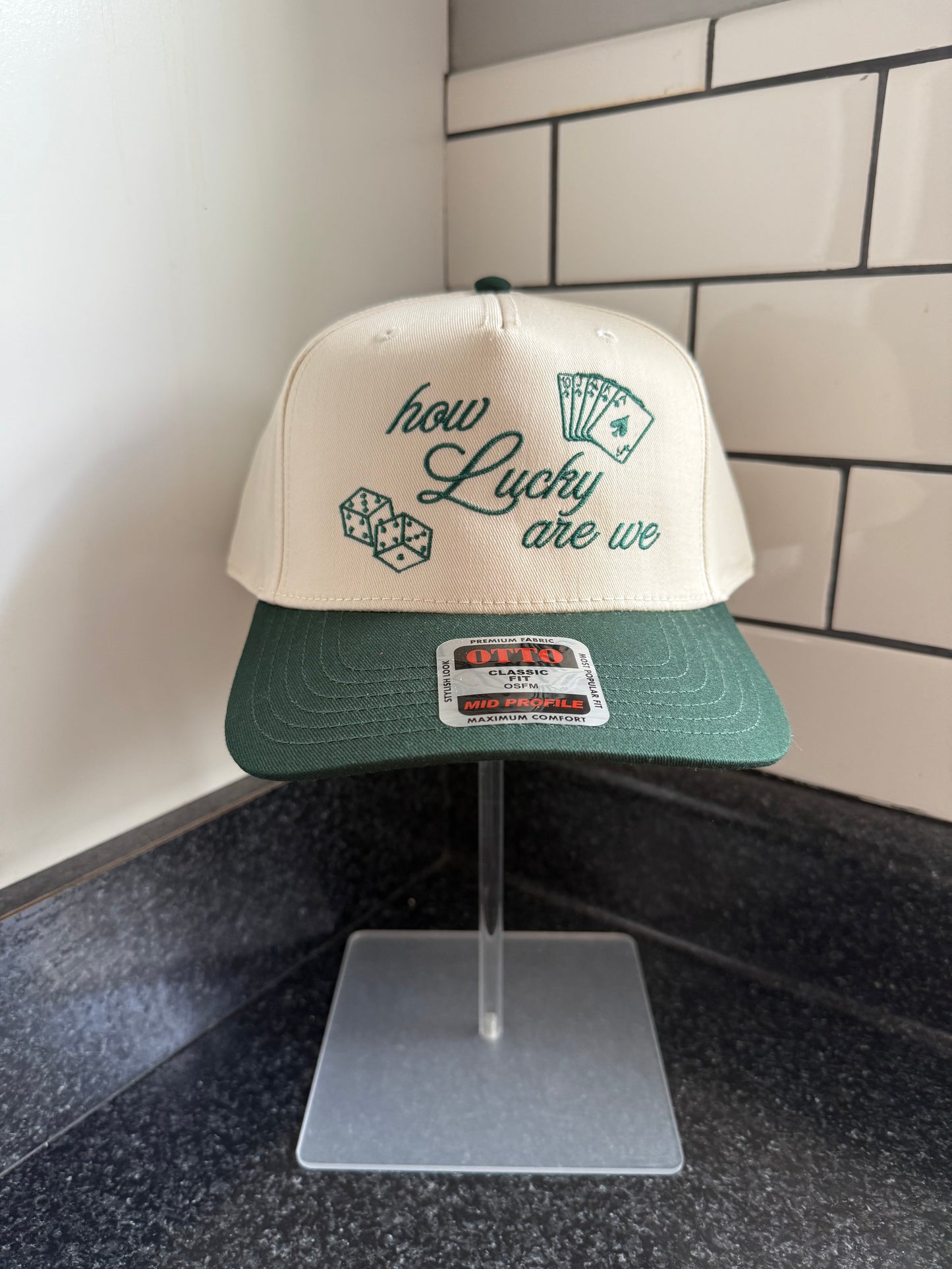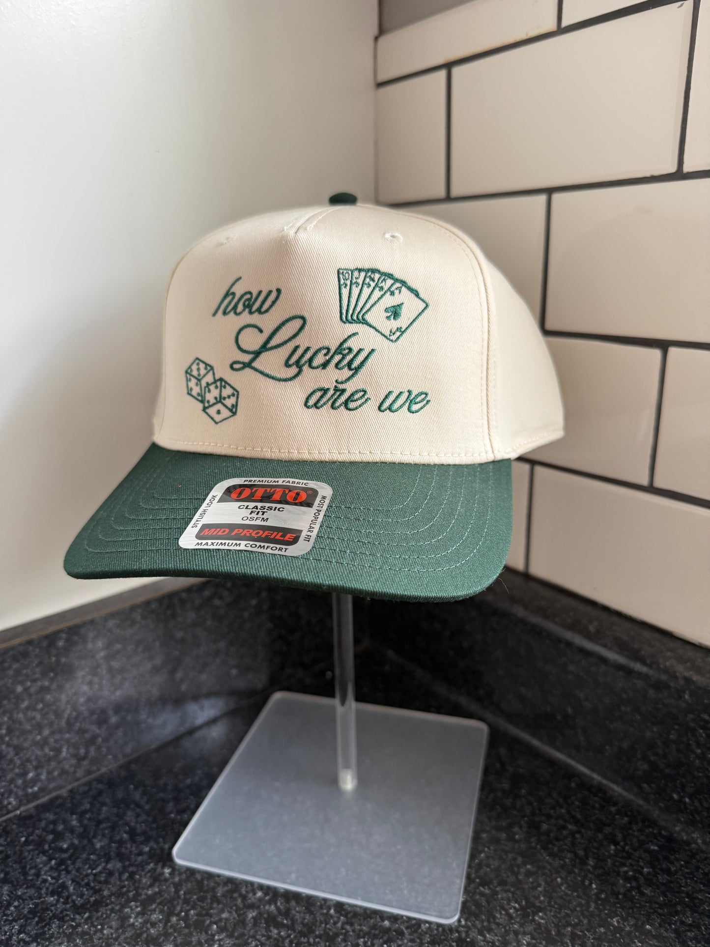 Our "How Lucky Are We" Trucker Hat is here and WOWZA - We absolutely love this hat in the green/natural color with green embroidery! 🍀🎲🌟🍒